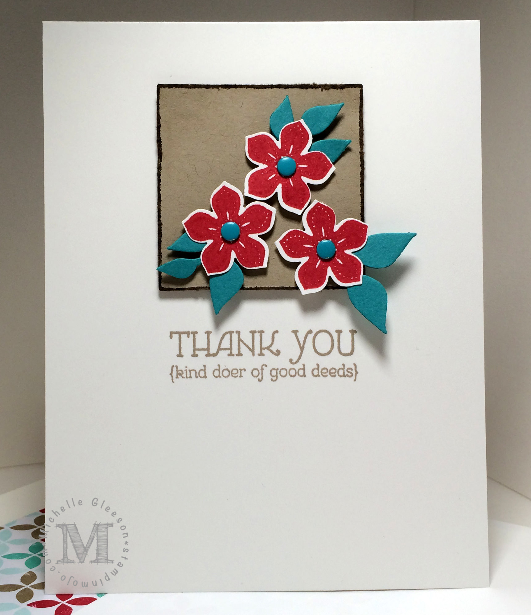Using a standard A2 card size I cut the square using the third square framelit.  Using my Distressing Tool I "frayed" the edges of the square and then dipped it into my Crumb Cake ink pad.  Then using the Petite Petals Stamp Set and matching punch created the flowers.  The Bermuda Bay leaves came from using the Little Leaves Sizzlits die (retiring).  And Bermuda Bay candy dots were the finishing touch.  The sentiment came from the Lots of Thanks stamp set.
